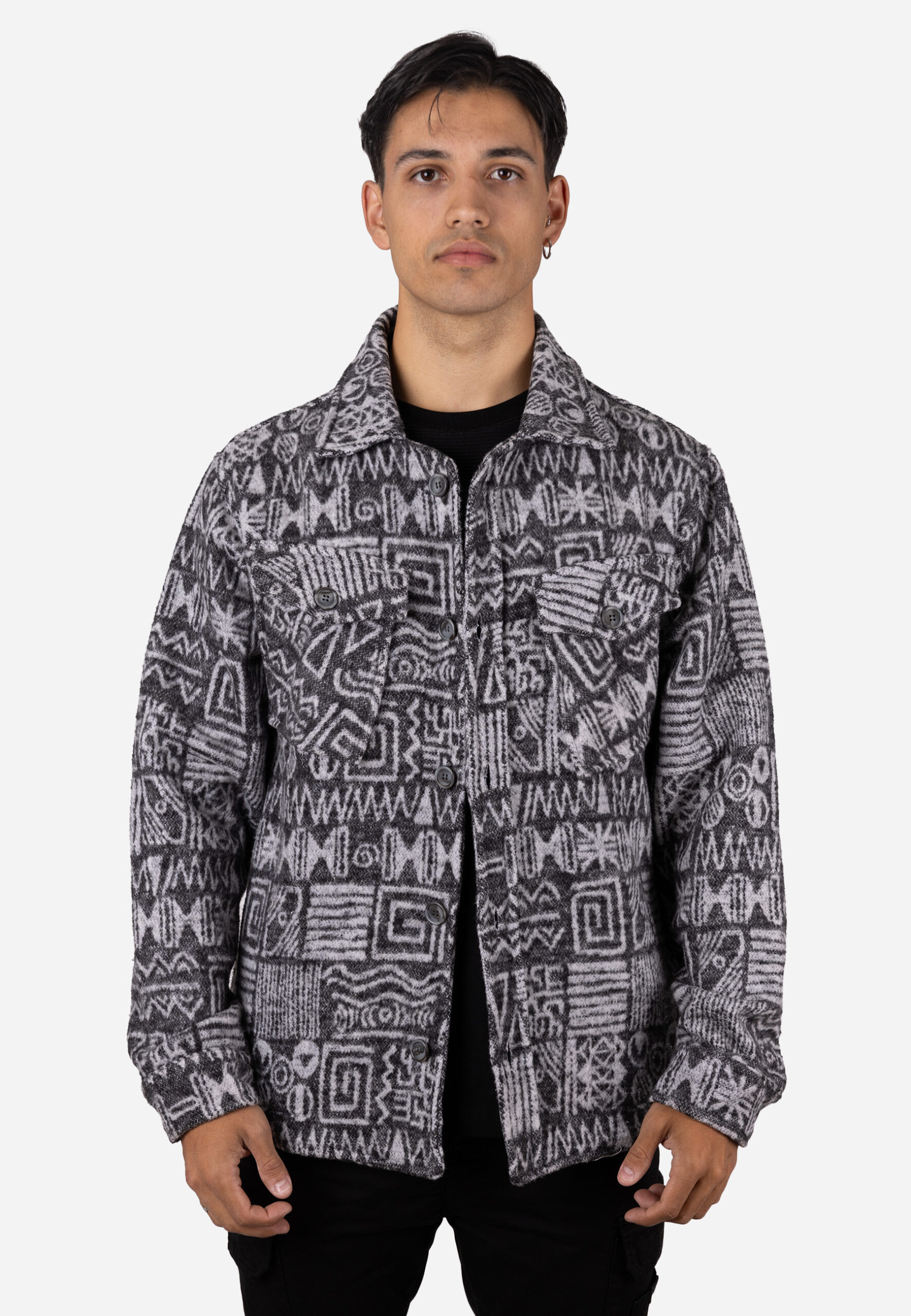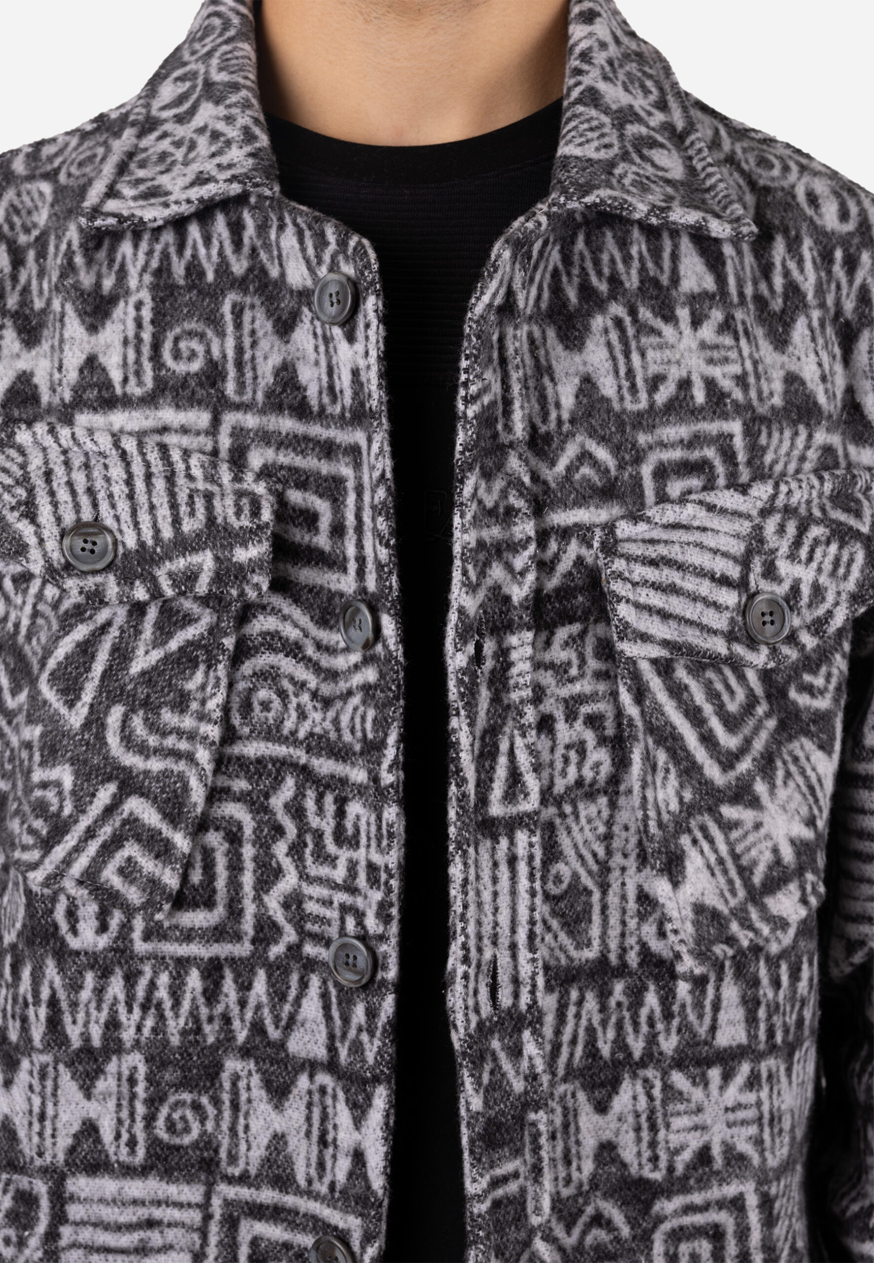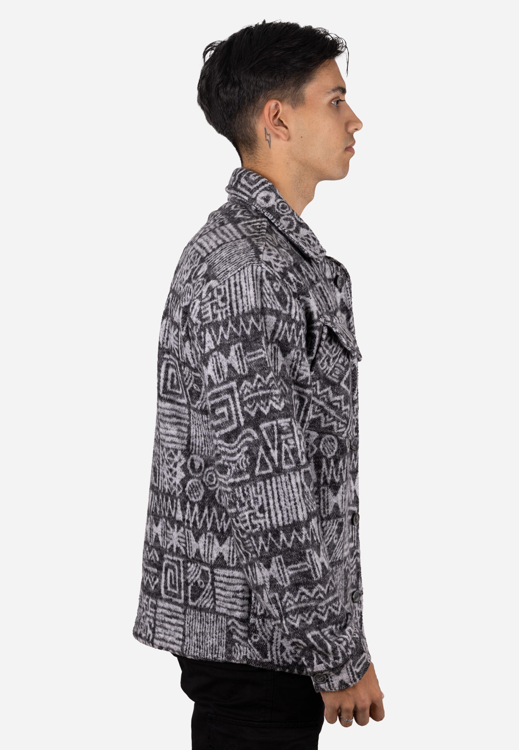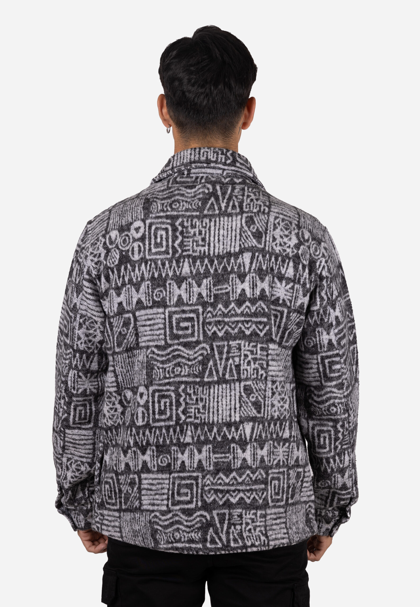 Chaqueta de paño confeccionada en 100% algodón, diseñada con un llamativo estampado tribal en distintos tonos de gris, que aporta un estilo único y sofisticado. Mantiene la estructura del modelo anterior: corte recto, cuello camisero clásico y cierre frontal con botones, proporcionando una silueta limpia y moderna.
