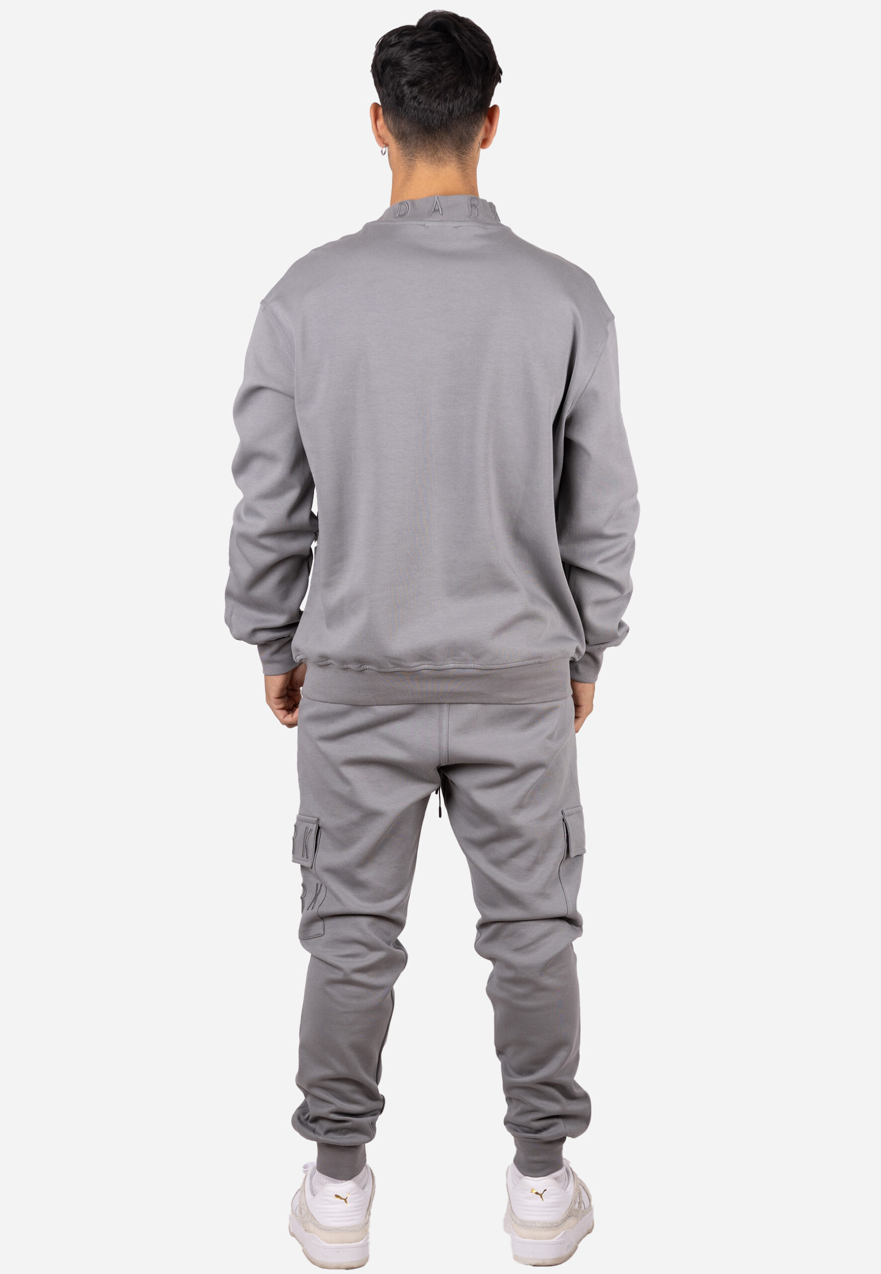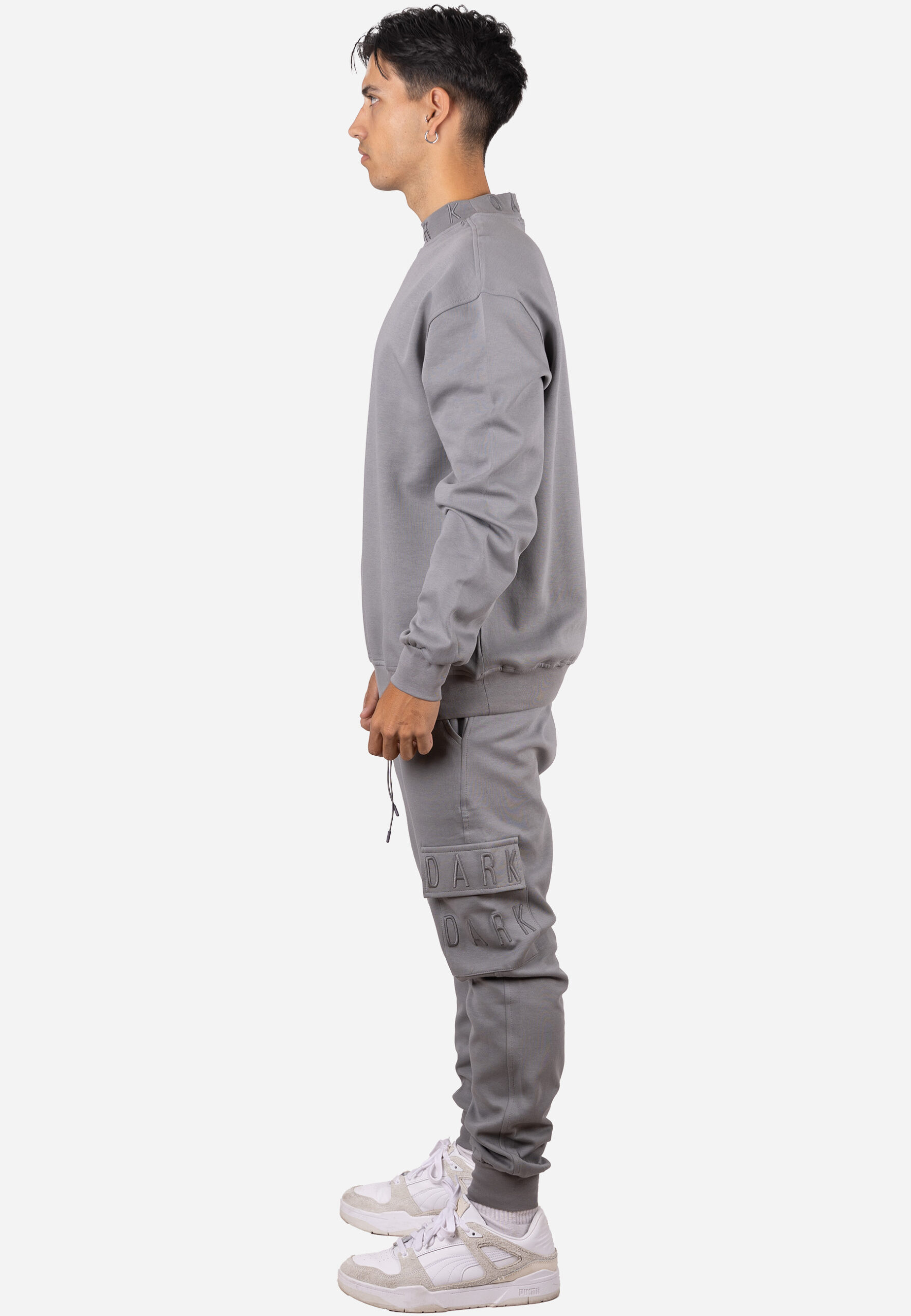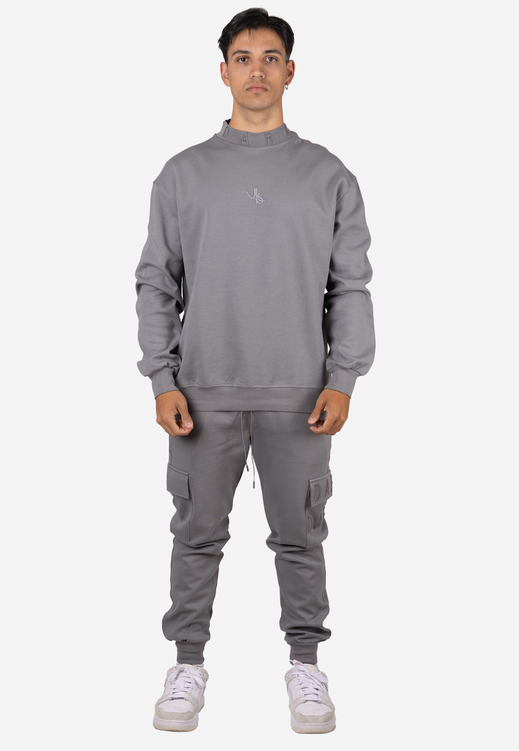 Conjunto de dos piezas formado por una sudadera de cuello alto y un pantalón jogger estilo cargo a juego. La sudadera presenta un diseño limpio en tono gris con cuello alto estructurado y detalle bordado minimalista en el pecho. El bajo y los puños en canalé garantizan un ajuste cómodo y mantienen la forma con el uso.