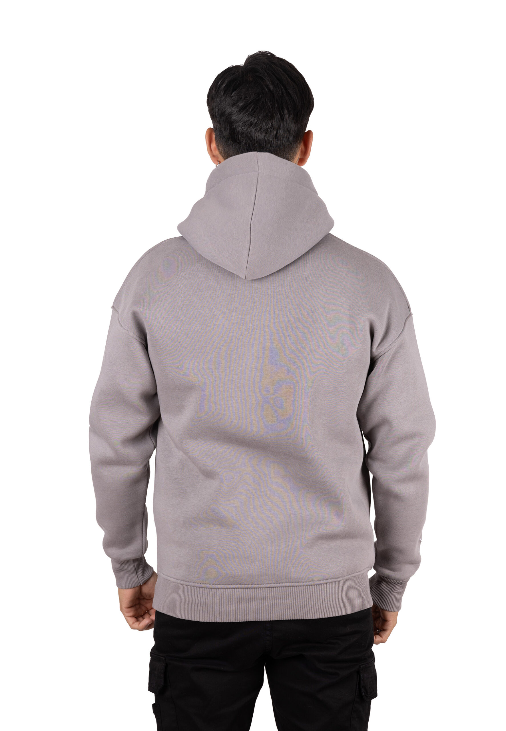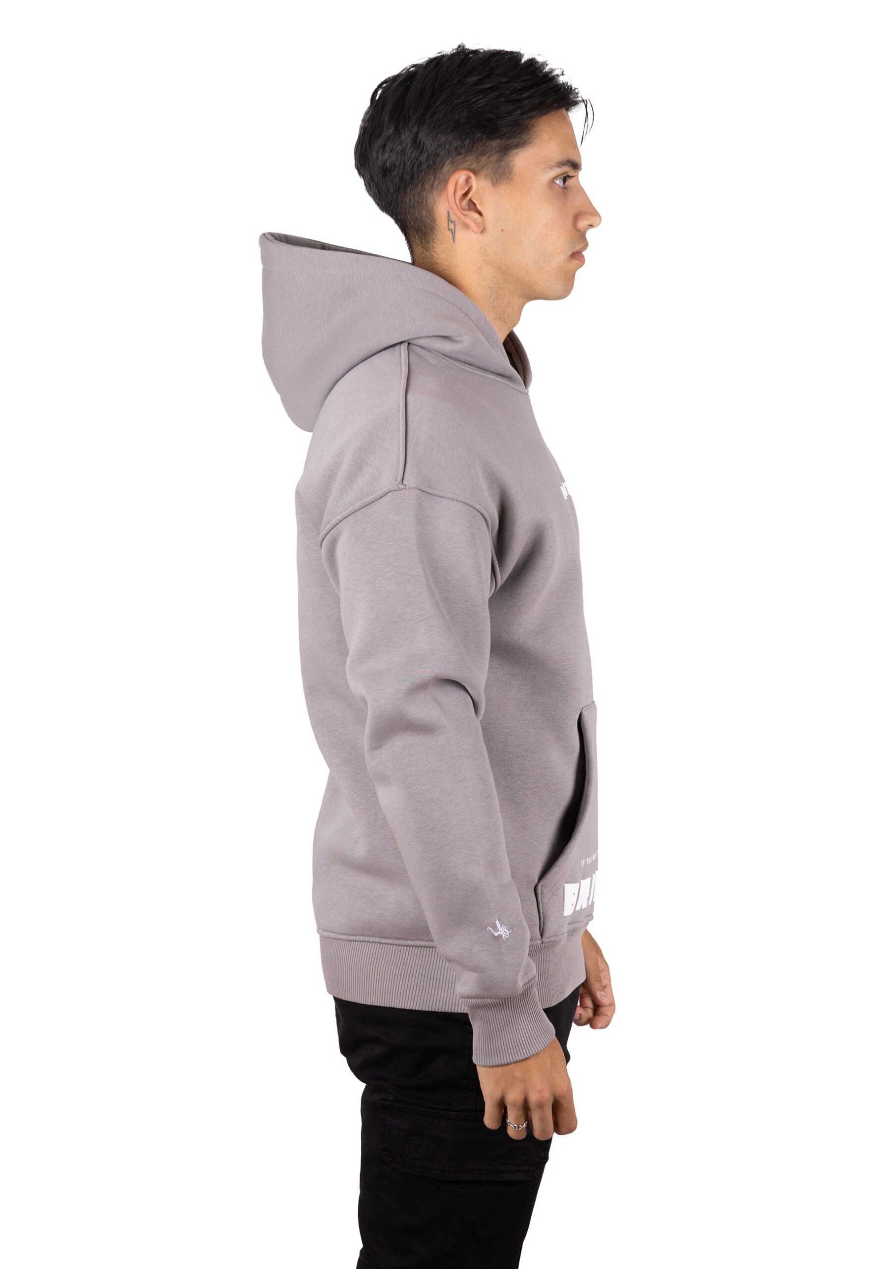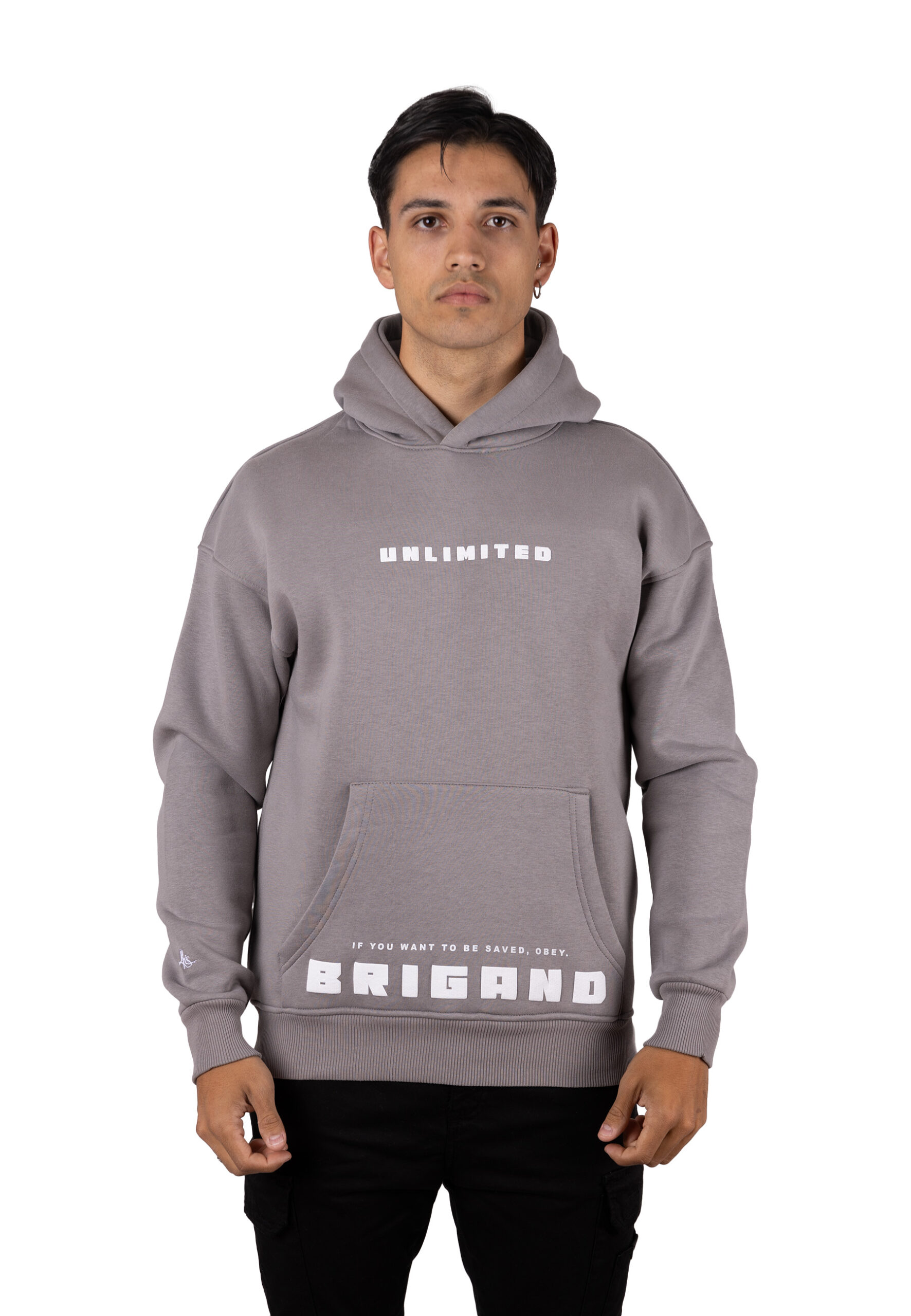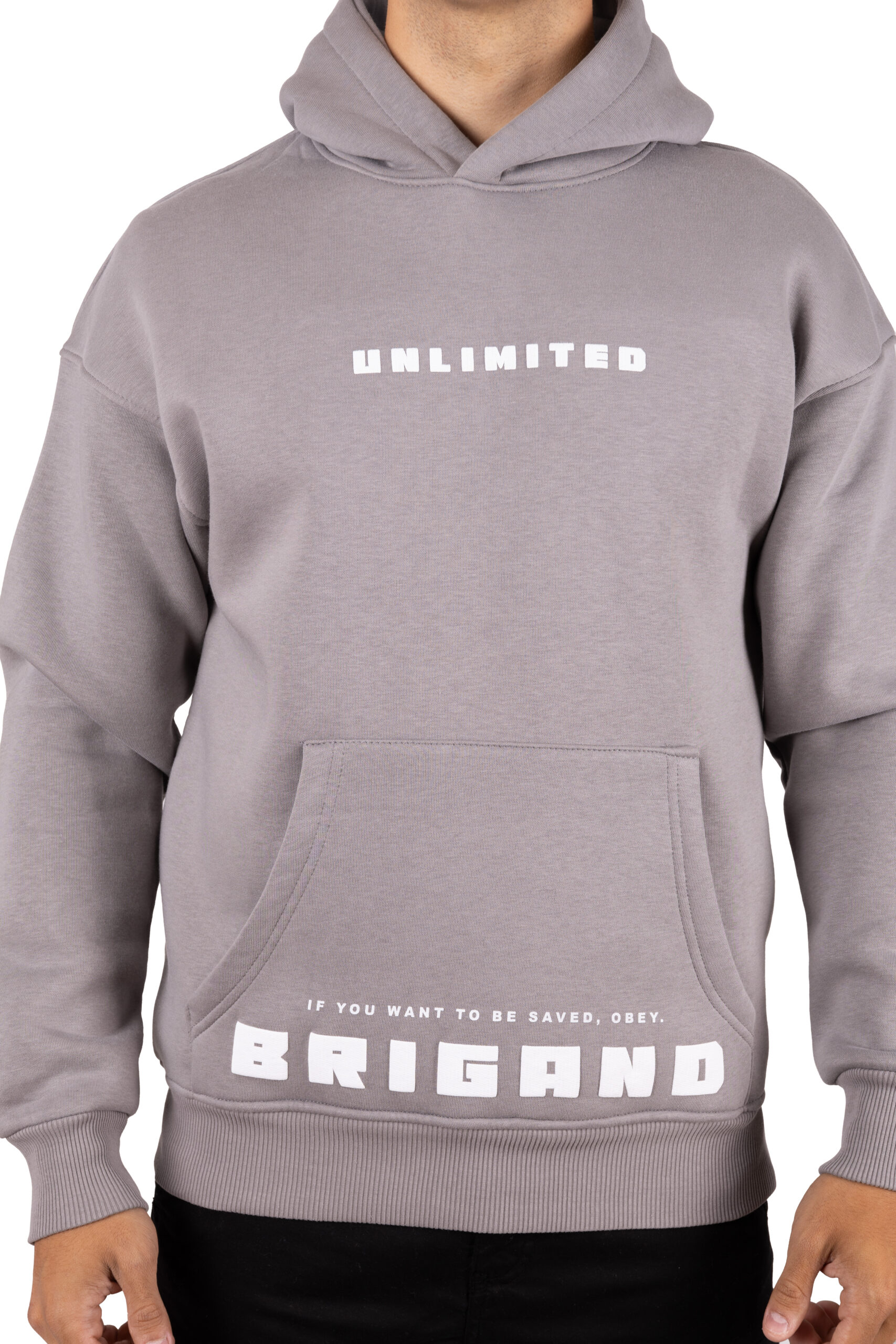Sudadera de hombre con capucha tipo hoodie en tono gris, con diseño gráfico minimalista en el pecho con la palabra “UNLIMITED” y un estampado tipográfico BRIGAND en el bajo. Incluye bolsillo canguro delantero, puños y cinturilla de canalé para un ajuste cómodo y buen mantenimiento de la forma. El corte es relajado, ofreciendo comodidad y estilo urbano para looks casuales.