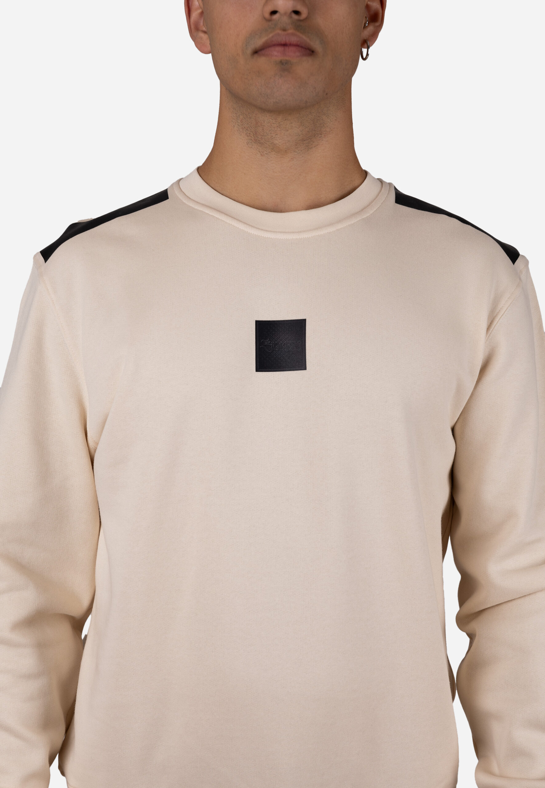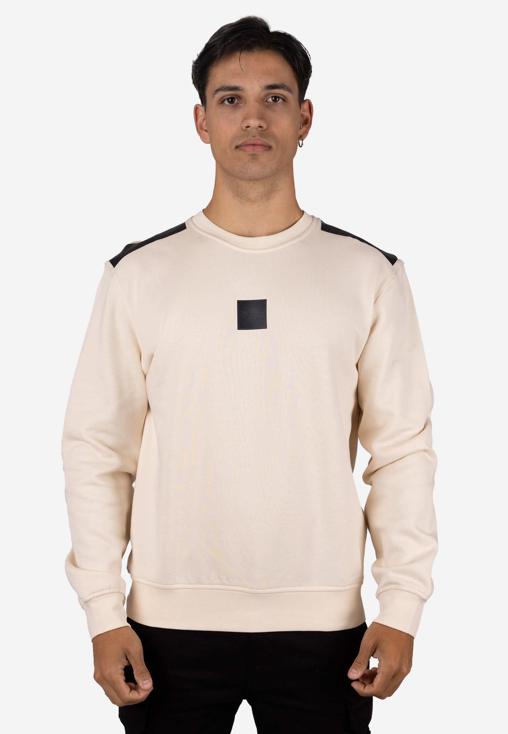 Sudadera de cuello caja diseñada con un estilo moderno y limpio, que incorpora refuerzos en los hombros en tejido contrastado para un toque distintivo. Presenta un corte regular, puños y cinturilla en canalé, y un pequeño detalle centrado en el pecho que aporta un acabado minimalista y versátil. Su diseño combina estética urbana con un alto nivel de comodidad, ideal para looks casuales durante todo el año.